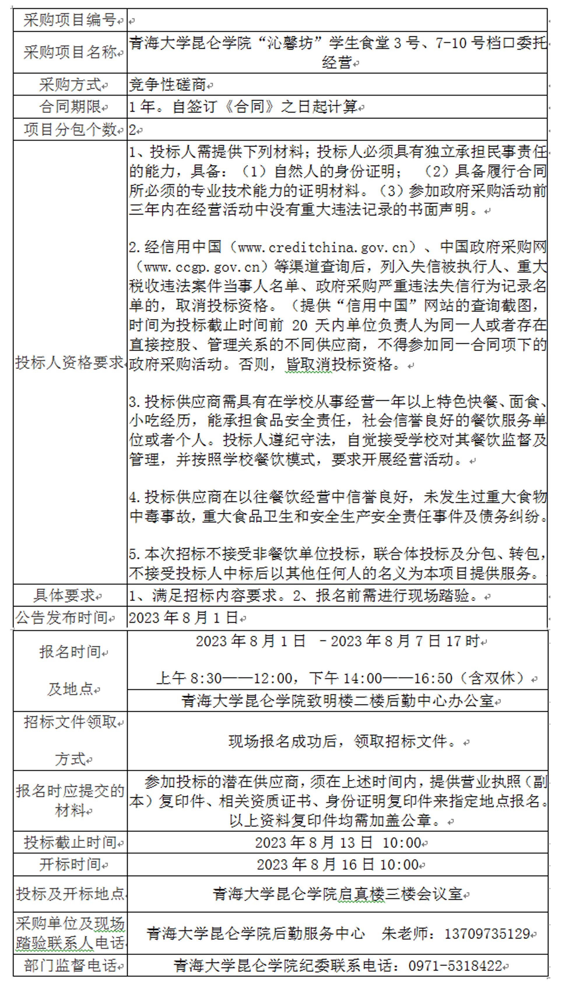 根据工作需要,对学院“沁馨坊”学生食堂3号、7-10号档口进行对外“零租赁”承包经营,现面向社会进行招标,欢迎符合条件的供应商前来投标。